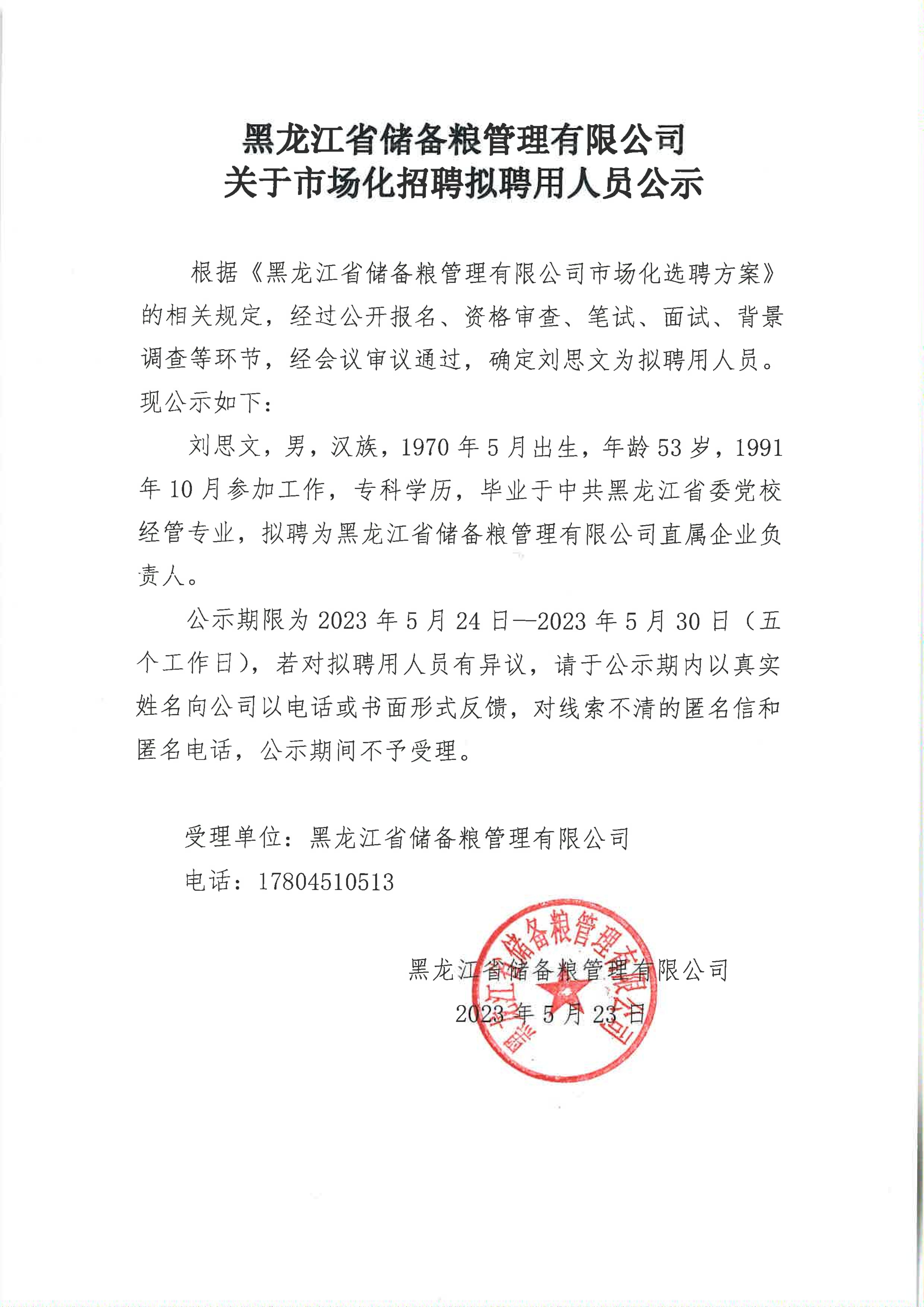 黑龍江省儲(chǔ)備糧管理有限公司關(guān)于市場(chǎng)化招聘擬聘用人員公示