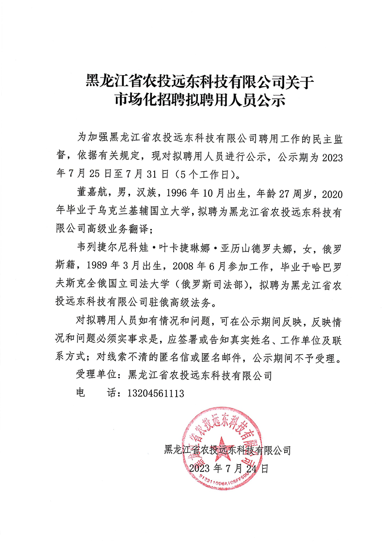 黑龍江省農(nóng)投遠(yuǎn)東科技有限公司關(guān)于市場(chǎng)化招聘擬聘用人員公示