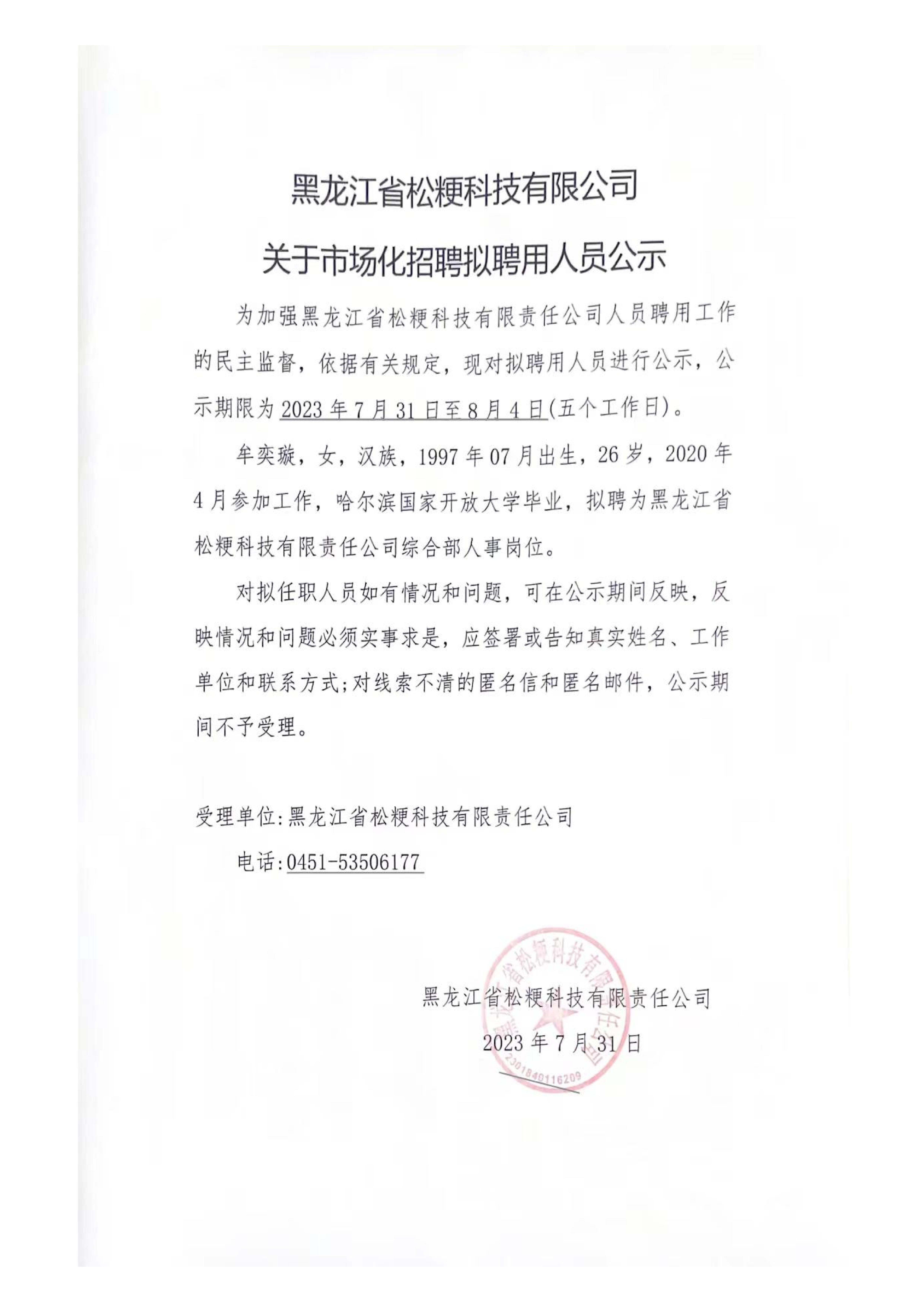 黑龍江省松粳科技有限責(zé)任公司關(guān)于市場化招聘擬聘用人員公示