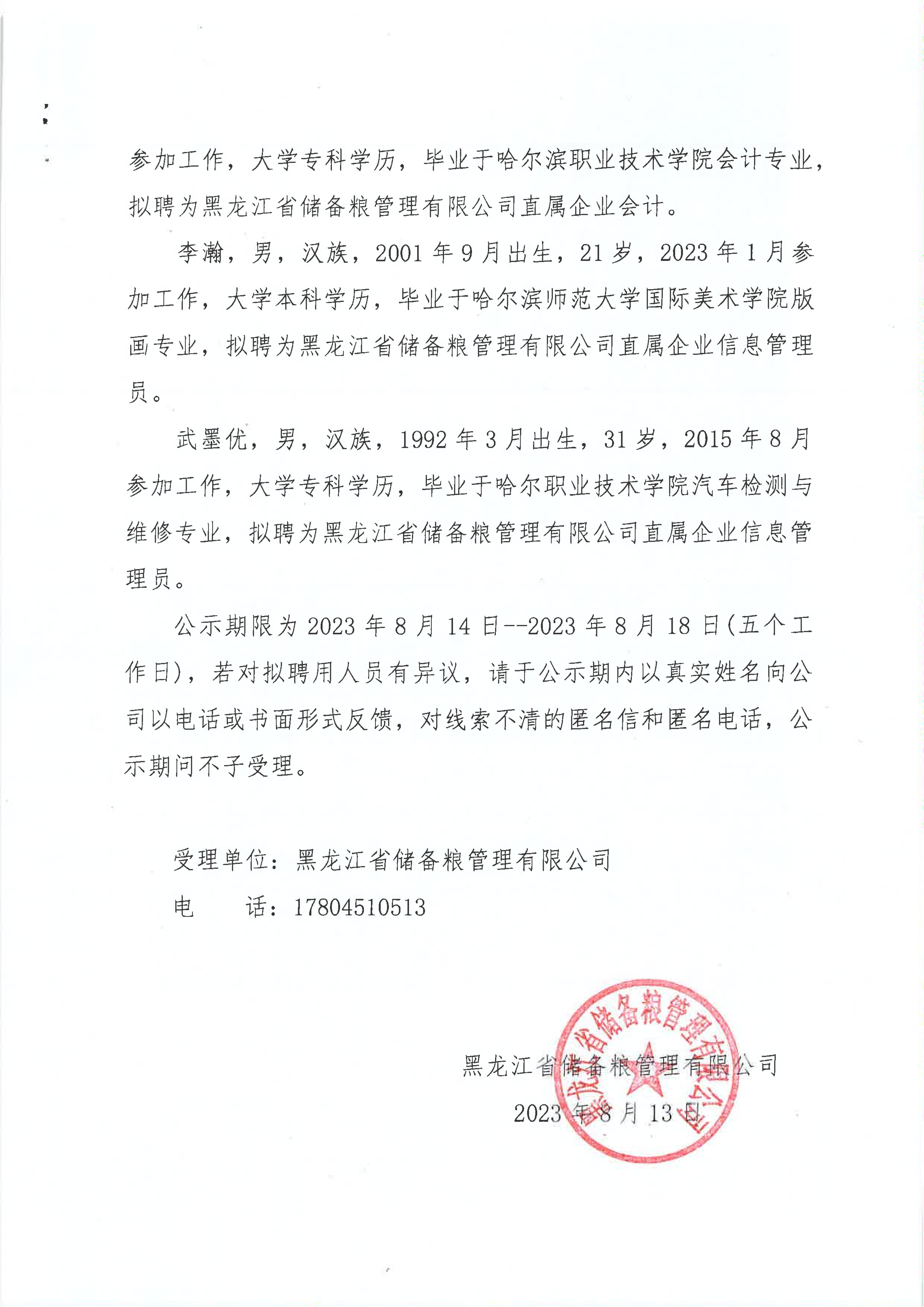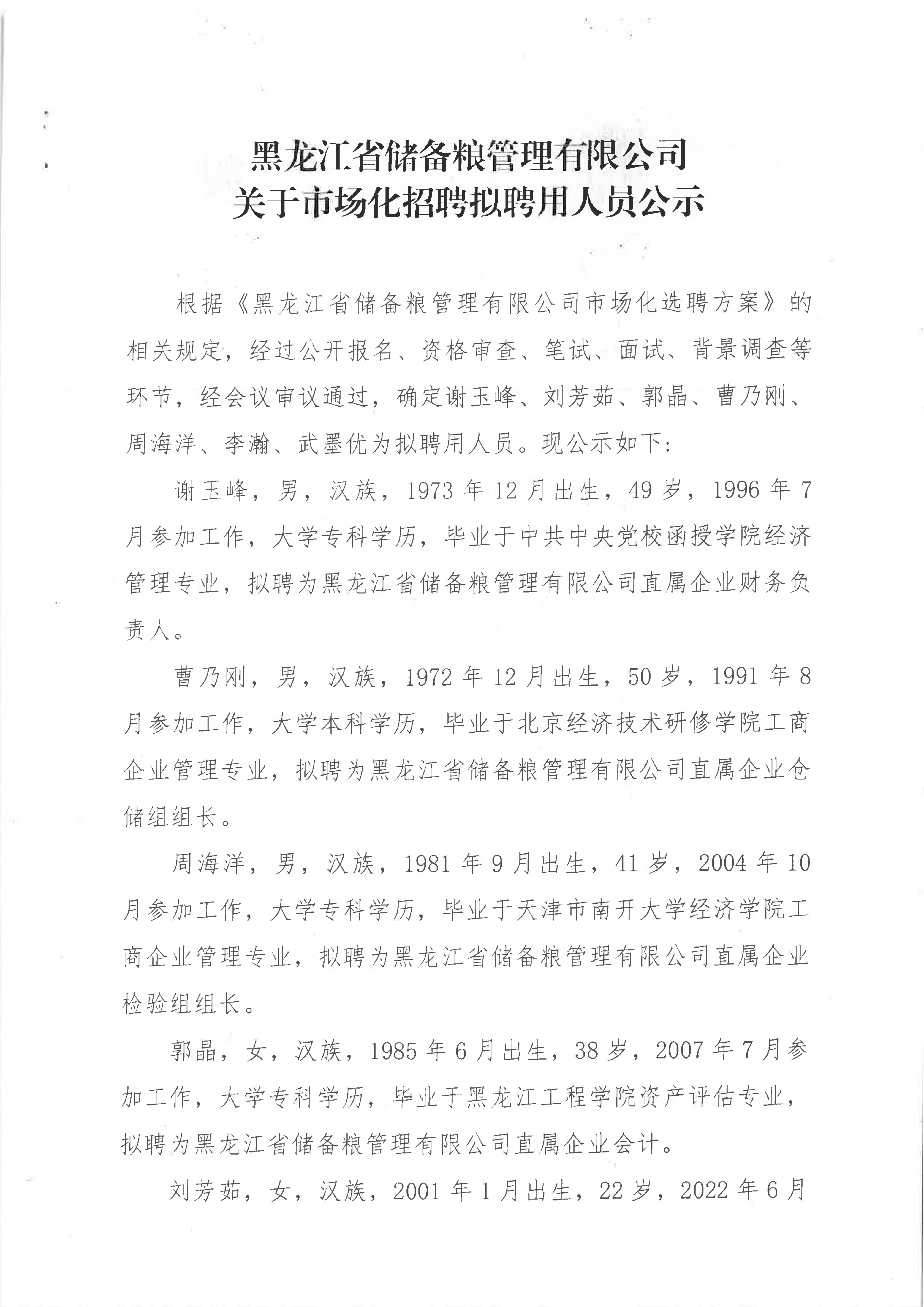 黑龍江省儲(chǔ)備糧管理有限公司關(guān)于市場(chǎng)化招聘擬聘用人員公示