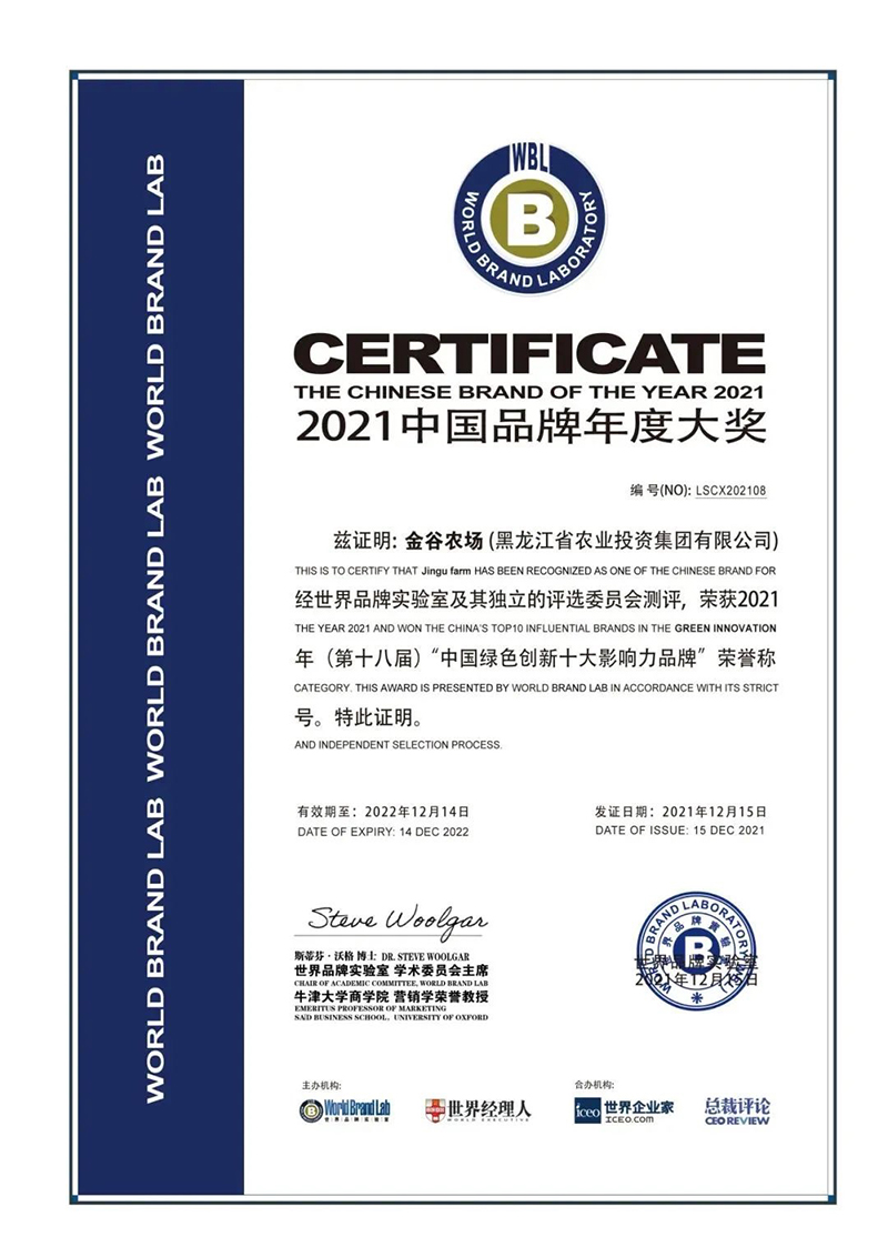 2021年12月15日,2021年“中國(guó)品牌年度大獎(jiǎng)”評(píng)選揭曉,農(nóng)投集團(tuán)旗下“金谷農(nóng)場(chǎng)”品牌在此次評(píng)選中榮獲“中國(guó)綠色創(chuàng)新十大影響力品牌”。