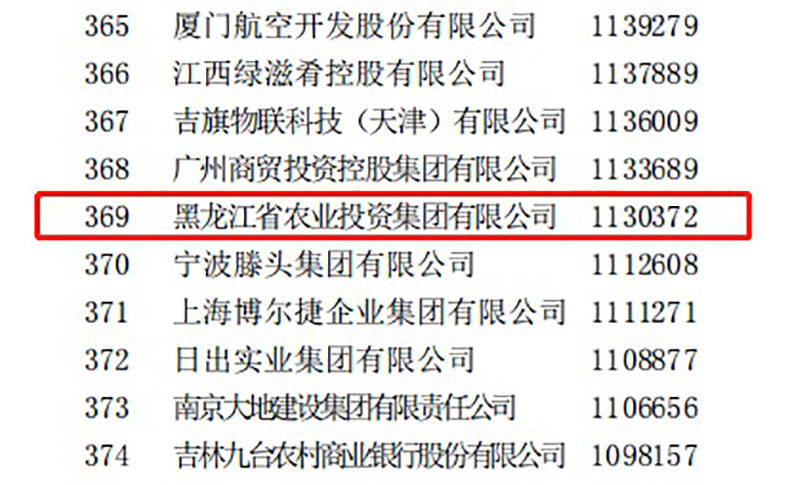 2021年9月25日,“2021中國(guó)500強(qiáng)企業(yè)高峰論壇”在長(zhǎng)春舉行,中國(guó)企業(yè)聯(lián)合會(huì)、中國(guó)企業(yè)家協(xié)會(huì)在會(huì)上發(fā)布了中國(guó)服務(wù)業(yè)企業(yè)500強(qiáng)名單,黑龍江省農(nóng)業(yè)投資集團(tuán)有限公司以2020年?duì)I業(yè)收入113.03億元的業(yè)績(jī)位列2021中國(guó)服務(wù)企業(yè)第369位。