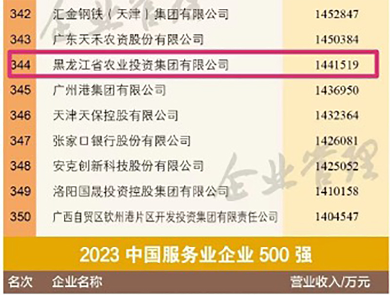 2023年9月20日,中國(guó)企業(yè)聯(lián)合會(huì)、中國(guó)企業(yè)家協(xié)會(huì)發(fā)布“2023中國(guó)服務(wù)業(yè)企業(yè)500強(qiáng)”榜單,黑龍江省農(nóng)業(yè)投資集團(tuán)有限公司(以下簡(jiǎn)稱“農(nóng)投集團(tuán)”)連續(xù)三年榮登“中國(guó)服務(wù)業(yè)企業(yè)500強(qiáng)”,以144億元的營(yíng)業(yè)收入,位列“2023年中國(guó)企業(yè)500強(qiáng)”第344位,位次較2022年度上升24位!