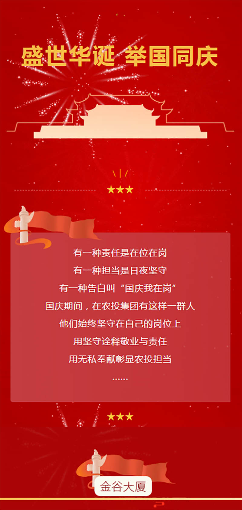 “功崇惟志,業(yè)廣惟勤?!鞭r(nóng)投金谷人在平凡的崗位上兢兢業(yè)業(yè),以昂揚的姿態(tài)慶祝中華人民共和國成立75周年,用奮斗書寫著高質(zhì)量發(fā)展的新篇章。