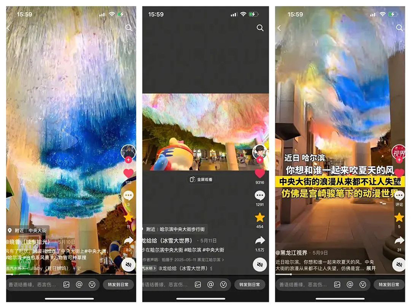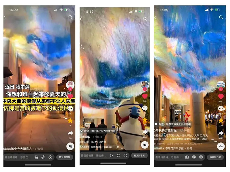 立足“酒店即目的地”的發(fā)展定位,金谷大廈借鑒西安、廈門等城市網(wǎng)紅地標(biāo)運(yùn)營(yíng)經(jīng)驗(yàn),于避暑旅游旺季來臨前完成“天空之境”主題美陳場(chǎng)景建設(shè)。該場(chǎng)景占地約66平方米,以動(dòng)態(tài)藝術(shù)裝置重構(gòu)空間美學(xué)——采用特種細(xì)絲面料打造由北向南延展的“爾濱浪花”矩陣,通過微風(fēng)動(dòng)力學(xué)裝置模擬江海與天穹的光影交織,構(gòu)建虛實(shí)交融的沉浸式視覺空間。自落成以來,該場(chǎng)景日均吸引游客及攝影創(chuàng)作者超2000人次,在抖音、小紅書等平臺(tái)形成“#爾濱天空之境”話題矩陣,相關(guān)短視頻播放量突破1200萬次,成功躋身哈爾濱城市地標(biāo)打卡熱榜TOP10。