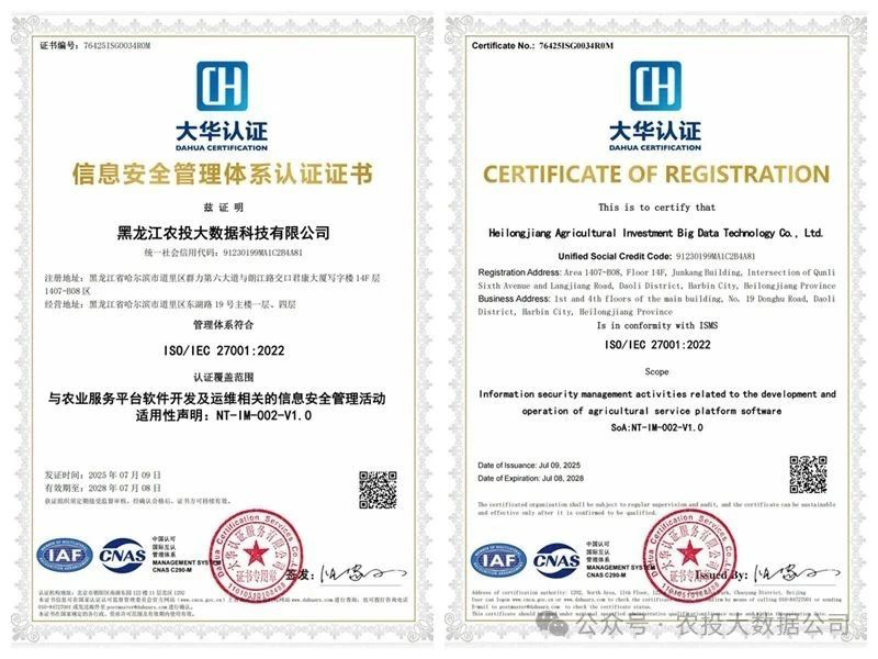 ISO/IEC 27001作為全球信息安全管理體系的權(quán)威標(biāo)準(zhǔn),其核心在于建立系統(tǒng)化的安全策略、實(shí)施嚴(yán)格的風(fēng)險(xiǎn)管控、并確保數(shù)據(jù)在采集、傳輸、存儲(chǔ)、處理、共享直至銷(xiāo)毀的全流程中得到全方位保障。大數(shù)據(jù)公司成功獲此認(rèn)證,深度契合國(guó)家“強(qiáng)化數(shù)據(jù)安全、護(hù)航數(shù)字經(jīng)濟(jì)”的戰(zhàn)略導(dǎo)向,以及黑龍江省大力發(fā)展數(shù)字經(jīng)濟(jì)、建設(shè)“數(shù)字龍江”、筑牢國(guó)家糧食安全網(wǎng)絡(luò)防線的核心任務(wù),為龍江數(shù)字農(nóng)業(yè)的騰飛奠定了由國(guó)際標(biāo)準(zhǔn)認(rèn)證的安全基石。